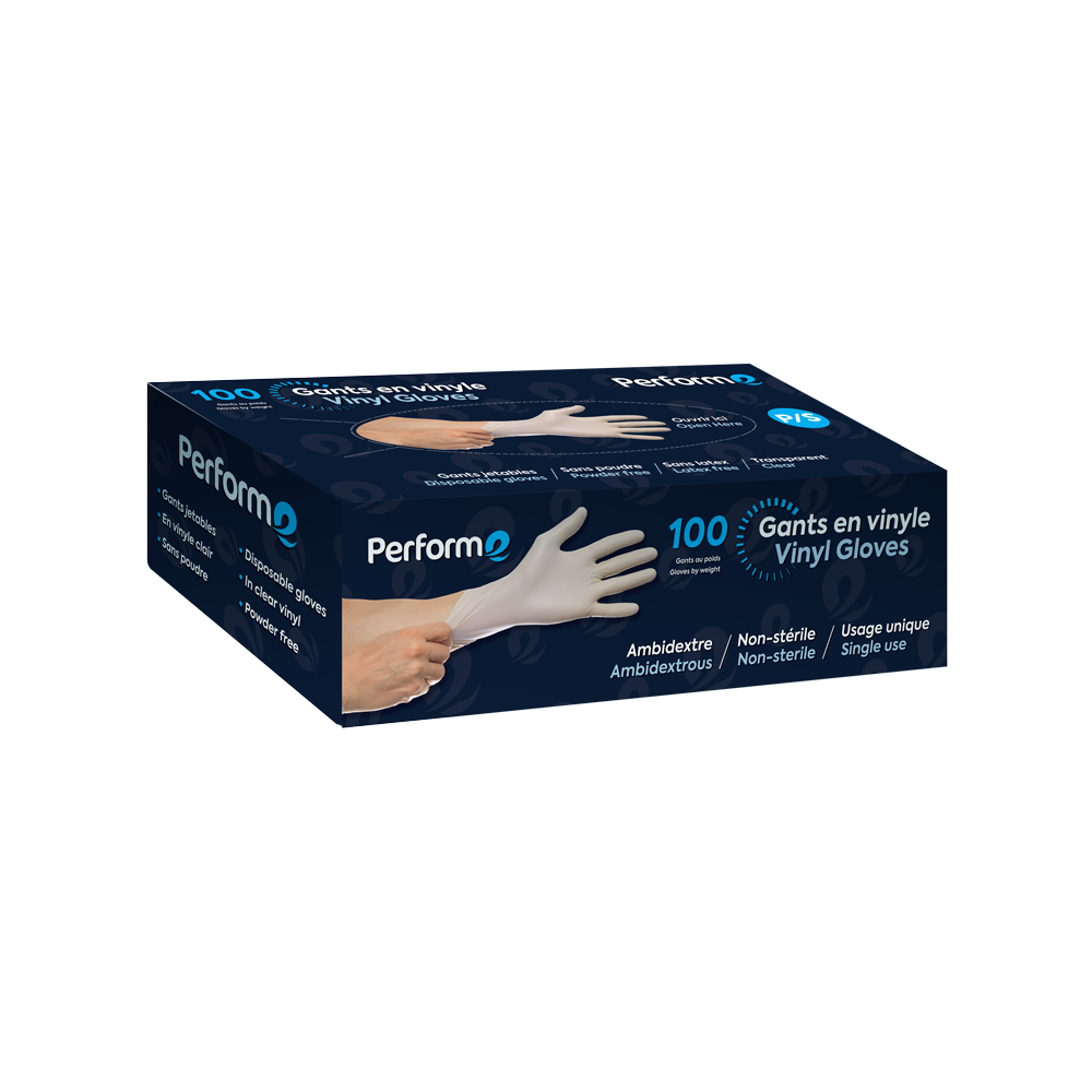 Gants de vinyle jetables transparent, grandeur Petit. 100 gants par boîtes. Sans poudre.